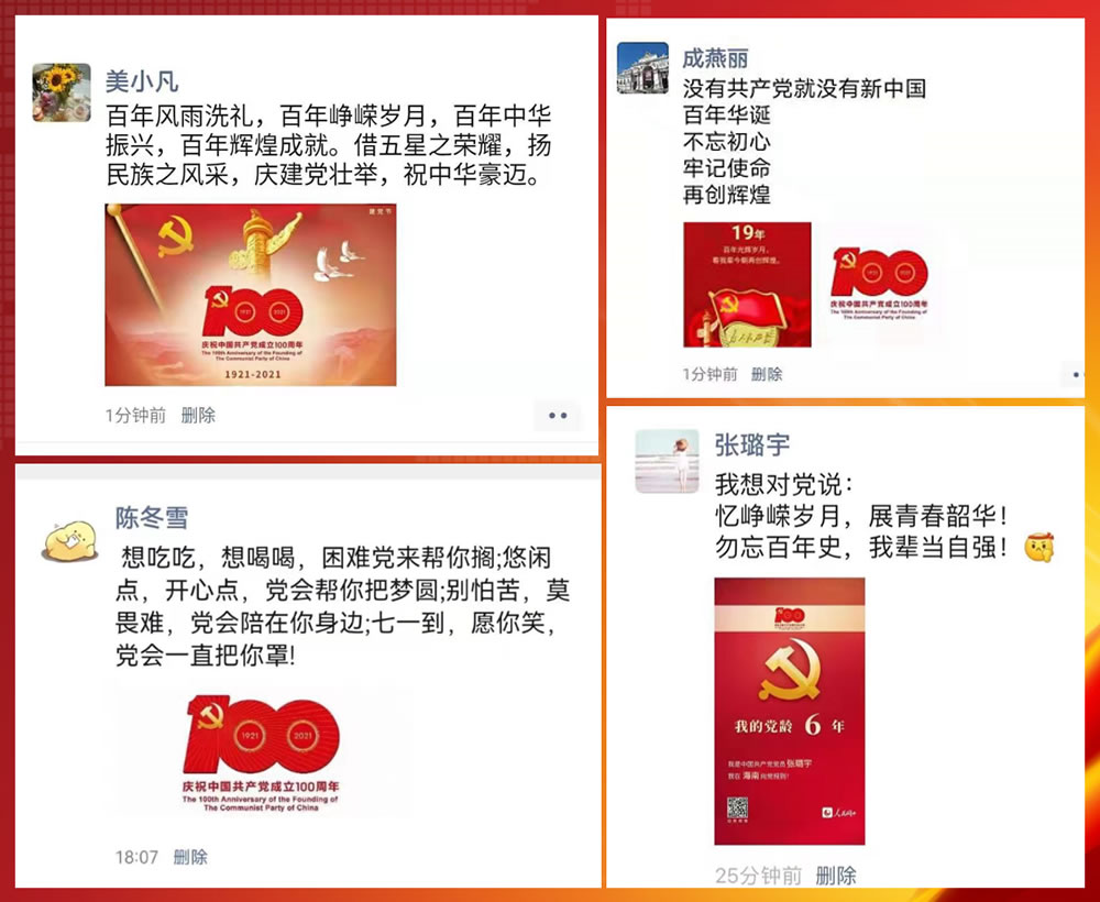 奮斗百年路,啟航新征程。為慶祝黨的百年華誕,激發(fā)黨員群眾愛黨愛國熱情,近日來,公司各級黨組織、團組織積極組織黨員和團員青年開展了形式多樣的主題活動,表達(dá)對中國共產(chǎn)黨的無限熱愛和對祖國的美好祝福!