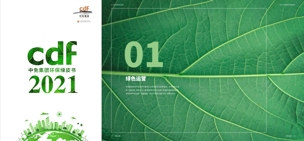 值此“碳中和”元年之際,中免集團編制發(fā)布了以“在cdf發(fā)現環(huán)保之美”為主題的《2021中免集團環(huán)保綠皮書》,系統(tǒng)地梳理、展示了中免集團在環(huán)保、可持續(xù)發(fā)展方面所做的各項舉措,向社會大眾傳達“綠色中免”的環(huán)保理念。全書包含綠色運營、綠色建造、綠色物流與供應鏈、綠色影響力四部分,詳細介紹了中免集團在能源管理、包裝材料管理、辦公系統(tǒng)、建筑環(huán)保節(jié)能、智慧供應鏈等方面的內容?!?021中免集團環(huán)保綠皮書》使用環(huán)保油墨、FSC認證環(huán)保紙印刷,通過環(huán)保材質媒介展示中免環(huán)保舉措,期待與讀者共同采取環(huán)保行動,守護美好星球的明天。