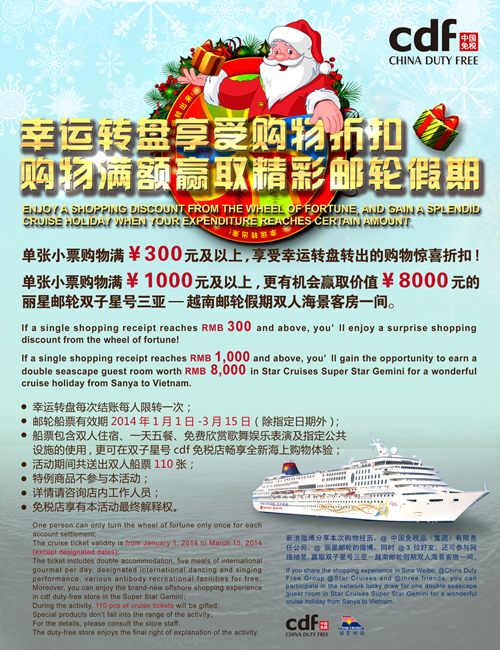 圣誕元旦臨近,旅游價格相對平穩(wěn)、上班族集中休假等因素使得今年雙節(jié)旅游市場再次迎來出游小高峰。其中不少公司白領(lǐng)將春節(jié)出境游計劃提前,選擇性價比更高的錯峰出游。各大商家的年終促銷活動讓節(jié)日提前升溫,2013年12月15日-2014年1月5日期間,中國免稅品(集團)有限責任公司(以下簡稱中免集團)旗下十家免稅店聯(lián)合推出“幸運轉(zhuǎn)出來&幸運秀出來”年終主題促銷活動,貼心的購物折扣以及價值約百萬元的麗星郵輪船票大獎,為雙節(jié)出境游客送上別樣驚喜。