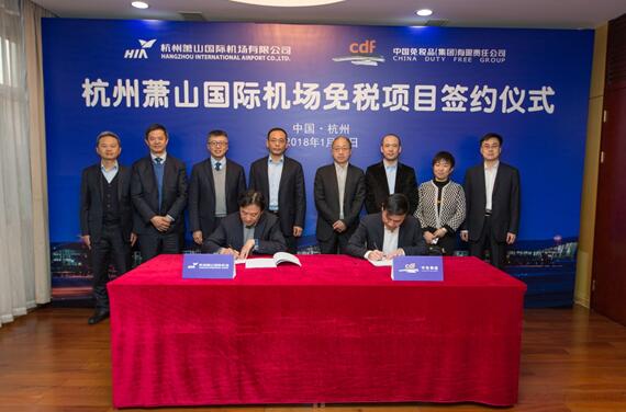 2018年1月11日,杭州蕭山國際機場免稅項目簽約儀式在機場綜合辦公樓舉行。中國免稅品(集團)有限責任公司董事長陳建山、副總經(jīng)理王軒,杭州蕭山國際機場有限公司董事長王敏、總經(jīng)理鄭向平以及相關(guān)人員出席了簽約儀式。