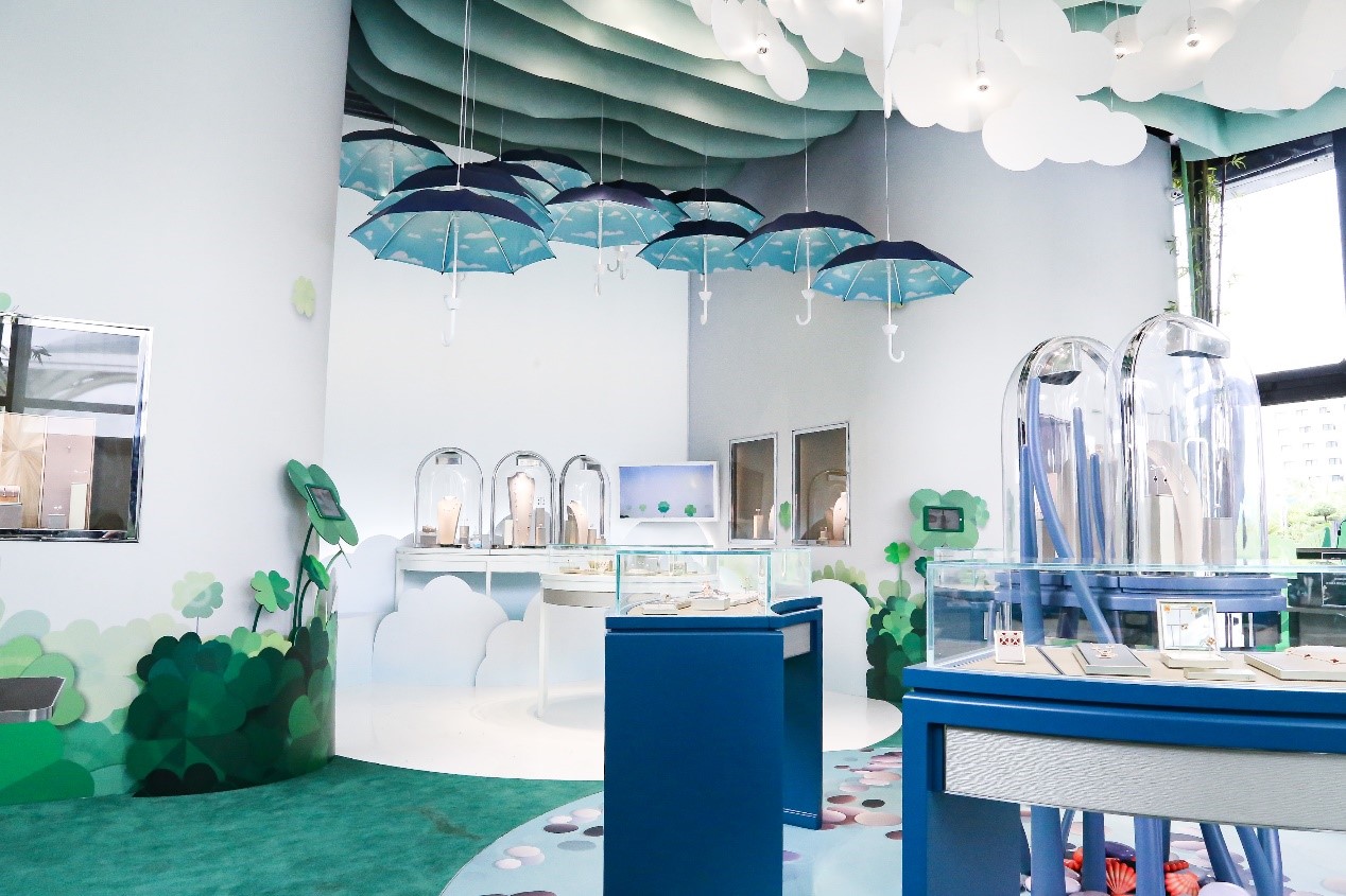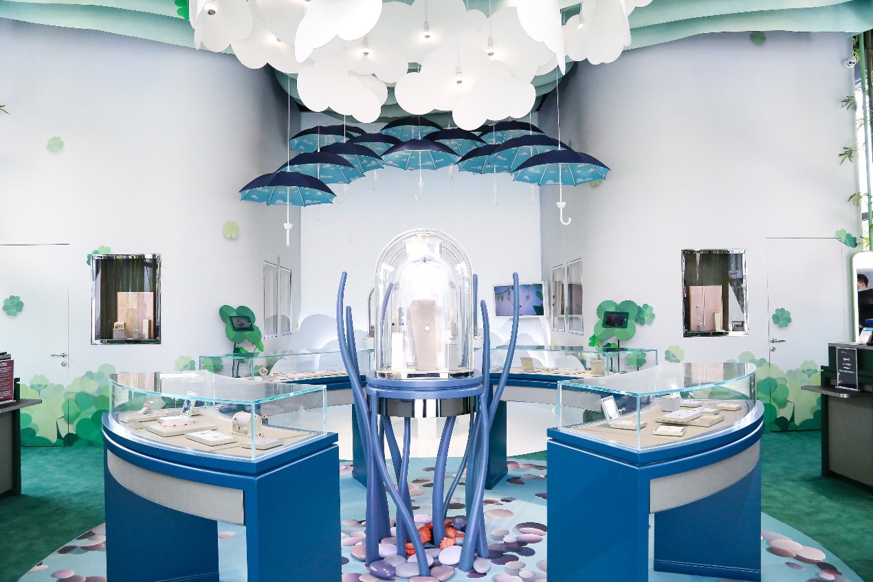 Van Cleef & Arpels梵克雅寶“Alhambra幸運(yùn)花園”免稅限時(shí)精品店位于三亞國際免稅城后廣場。世家要員雅克·雅寶Jacques Arpels常言道:“心懷幸運(yùn)之愿,方能成為幸運(yùn)之士。”幸運(yùn)是梵克雅寶一直以來十分珍視的價(jià)值,更是其創(chuàng)意靈感的泉源之一,因此限時(shí)精品店內(nèi)部設(shè)計(jì)以世家標(biāo)志性四葉幸運(yùn)圖案為主題,以延續(xù)這珍貴價(jià)值。進(jìn)店后,首先映入訪客眼簾的將是Burcu & Geoffrey 這對(duì)法國和土耳其的導(dǎo)演拍檔為Alhambra 特別創(chuàng)作的四葉圖騰造型蝴蝶沿途散播幸運(yùn)的種子,帶領(lǐng)游客穿梭在幸運(yùn)花園中,引領(lǐng)大眾一同探索夢(mèng)幻迷人的Alhambra 幸運(yùn)花園, 為游客營造出一種舒適愉快的珠寶欣賞空間。